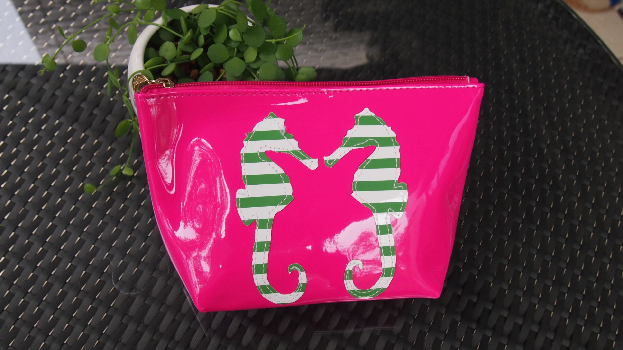エナメル素材のシーホース柄コスメポーチ。